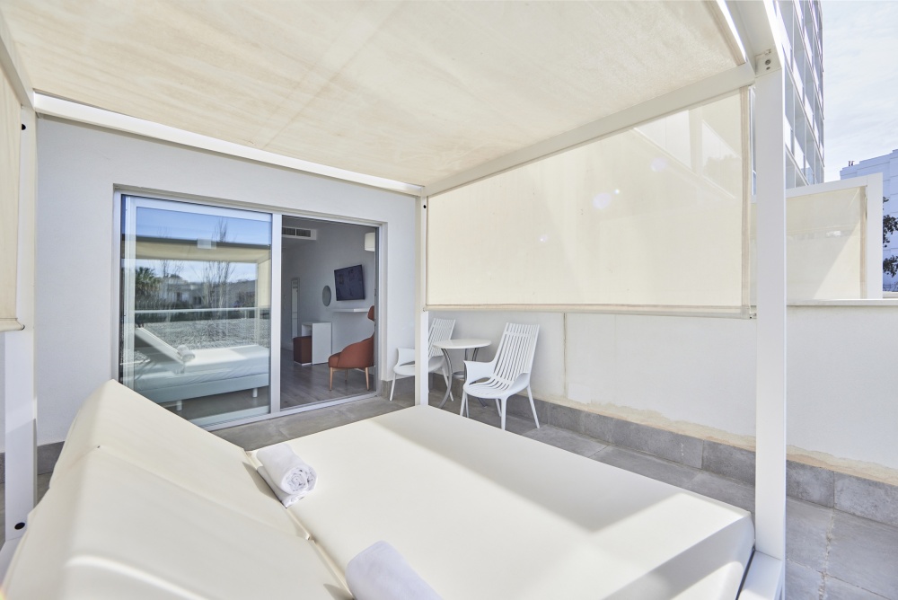 Ein Doppelzimmer im ersten Stock des Hotels Astoria mit eigener Terrasse und balinesischem Bett. Genießen Sie Ihre private Terrasse in Ihrem Hotel in Alcúdia.